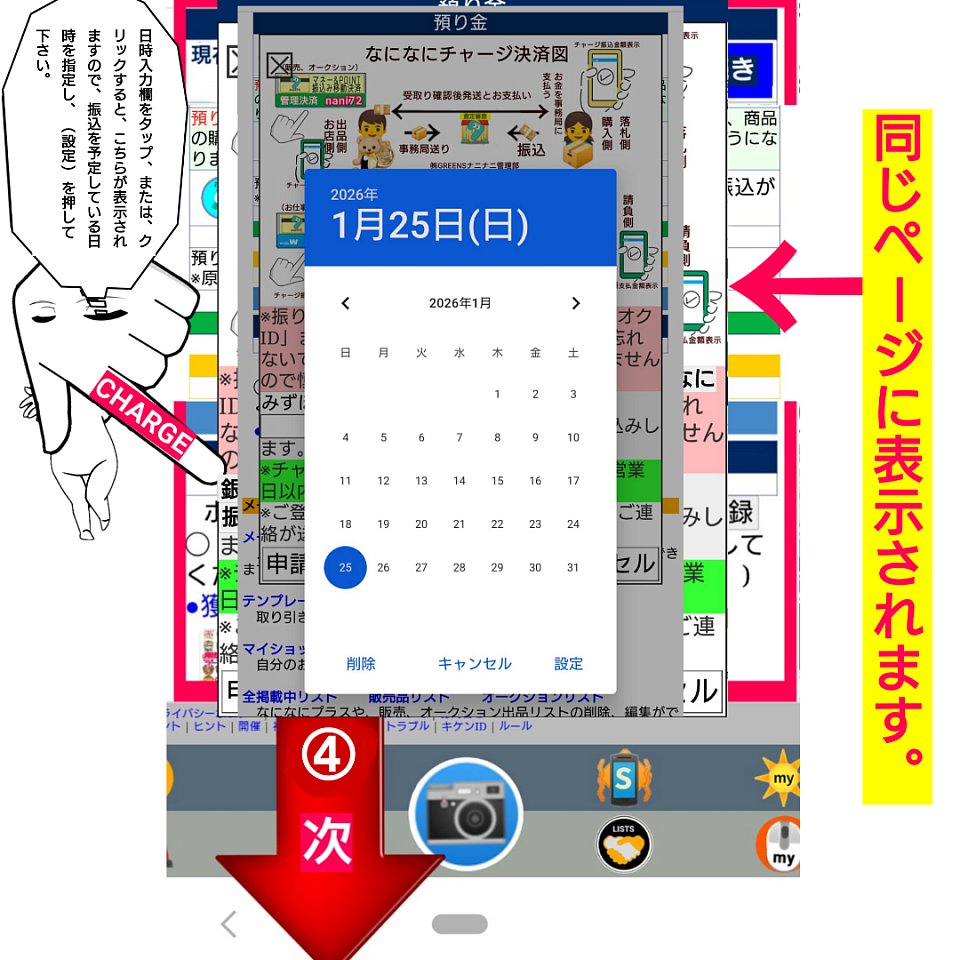 ①チャージ決済ページより、どこの銀行から、何月何日に、いくら振込をします。をなになに管理部に申請します。